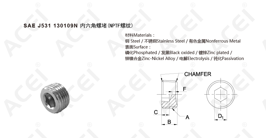 SAE J531 130109N 内六角螺堵(NPTF螺纹)